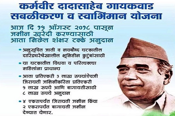 In order to provide sources of income to SC and Neo-Buddhist landless farmers below the poverty line, to empower these families and increase their self-esteem and to provide them with four acres of dry land or two acres of irrigated land. Information about this scheme is given in the form of percent grant and 50 percent grant and 50 percent loan.